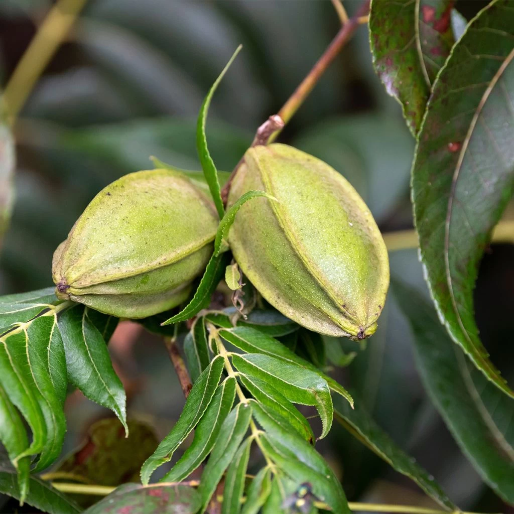 Le pacanier, en latin Carya illinoinensis, est l’arbre fruitier qui produit les noix de pécan. Rustique jusqu’à -15°C, il peut être planté dans la plupart de nos régions, mais la production de fruits aura lieu essentiellement dans le Sud de la France car il a besoin d’étés chauds et longs pour fructifier. Il offre ses noix au bout de 4 à 5 années de culture. A vous alors les brownies, les tartes, ou les gâteaux aux noix de pécan ! C’est un grand arbre fruitier à coque ancré sur de profondes racines, qui peut mesurer de 20 à 40 m de hauteur, mais il existe des variétés au développement plus modeste adaptées à des jardins plus petits telles que ‘ Choctaw’ ou ‘Pawnee’. Il forme un arbre robuste, à l’ombre dense et ses grandes feuilles pennées prennent une belle teinte dorée à l’automne avant de chuter. Sa belle écorce sillonnée et sa floraison printanière en longs chatons verdâtres sont d’autres de ses attraits. Il réclame un sol profond, frais à humide et de texture légère. Partiellement auto-fertile, il est conseillé de planter deux pieds pour s’assurer un bon rendement.